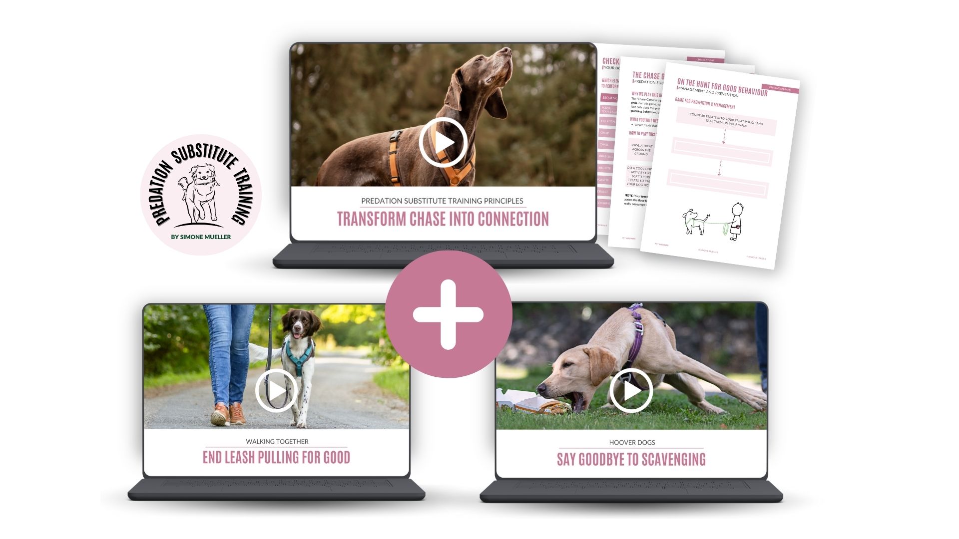 Get not only the Predation Substitute Principles Course but also the Walking Together and Hoover Dogs webinars for an exclusive bundle price. Learn force-free strategies to stop wildlife chasing, scavenging and to master loose lead walking — making walks safer and more enjoyable for you and your high (prey) drive dog!